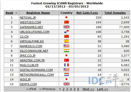 与2012年2月27日公布的数据相比,一周内,西部数码和SAFENAMES.NET各上升一个名次,分别位居第二、第三,URLSOLUTIONS.COM以净增长108跃居第四,NETOWL.JP和爱名网依然保持上周的记录,分别稳居第一,第五,而上周排名第二的中国万网,未在前5名之列。